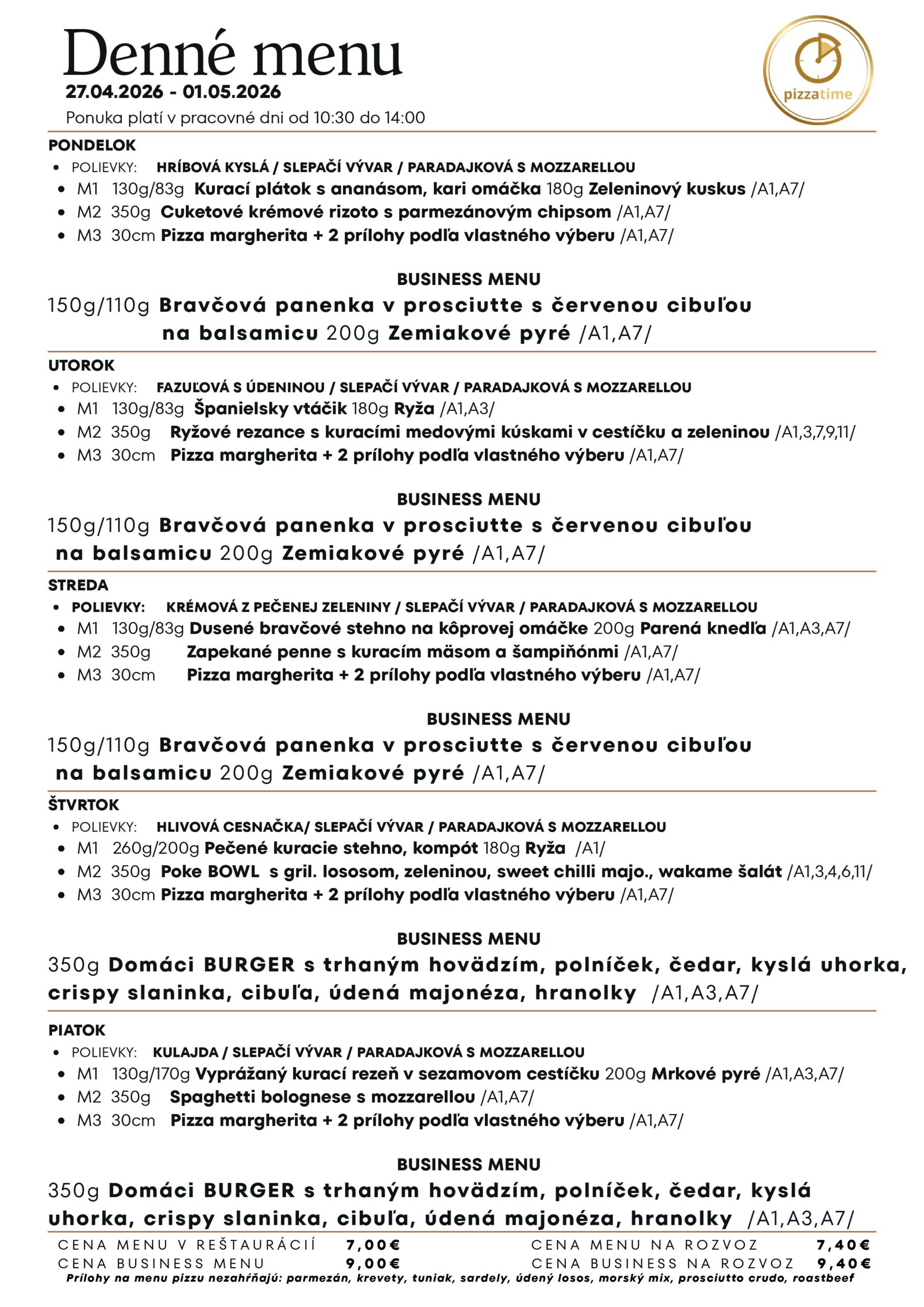 Každý pracovný deň máte na výber z troch polievok a dvoch hlavných jedál a menu pizze (MENU 1, MENU 2 a MENU 3).